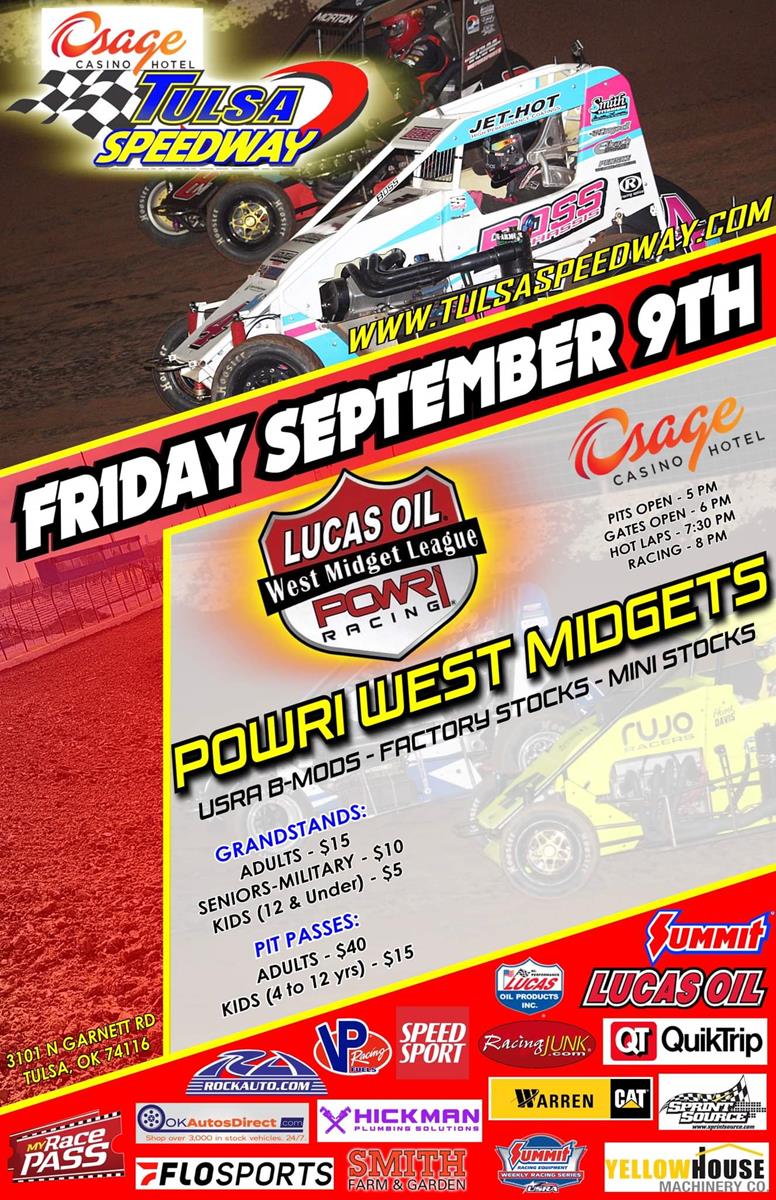 Powri West Midgets return to Osage Casino & Hotel Tulsa Speedway Friday September 9th.